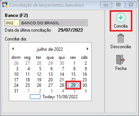 Clicando nessa opção, o sistema lhe apresentará a tela abaixo, clique no dia que deseja conciliar (neste caso, utilizamos o dia 29 de julho) e, depois, clique em “Concilia”.