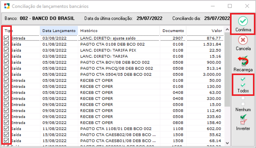 Selecione quais registros deseja conciliar e clique em “Confirma”.