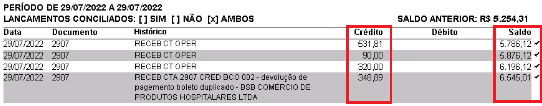 Podemos observar que tivemos 4 movimentações de recebimentos no dia 29 de julho e que o saldo do dia fechou em R$ 6.545,01, sendo que todos os registros desse dia estão conciliados (o “tique” ao lado do saldo indica essa situação).